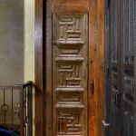 An antique door with a geometric overlay design was used to make this entry closet door. The door was set into a jamb with header made from salvaged heavy timbers.